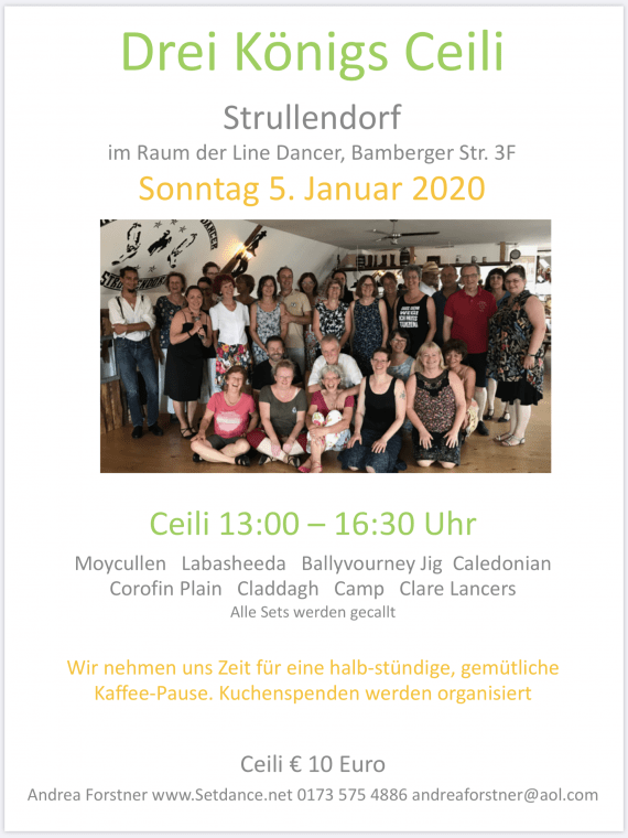 05.01.2020 @ 13:00 – 16:30 – Vor dem Erlanger Workshop im Februar gibt es wieder die wunderbare Gelegenheit zum gemeinsamen Spaß am Set Dance mit Tanz-Freunden der weiteren Region: Andrea Forstner veranstaltet dankenswerter Weise wieder das „Drei-Königs-Ceili“ in Strullendorf: Rückfragen und Anmeldungen bitte direkt an Andrea Forstner: mobil 0173-5754886, Email: andreaforstner@aol.com