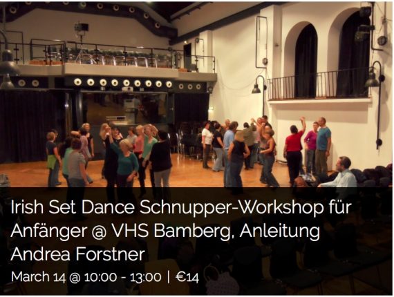 14.03.2020 @ 00:00 – Andrea Forstner, Set Dance Teacher aus Erlangen und Organisatorin des international bekannten „Irish Set Dance Weekends“, bietet am 14. März 2020 **** E N T F Ä L L T als Schutzmaßnahme gegen die Ansteckung mit dem Corona-Virus, wird voraussichtlich im Oktober d.J. nachgeholt **** eine Schnuppergelegenheit im Rahmen der Bamberger Volkshochschule zum Einstieg in diese […]