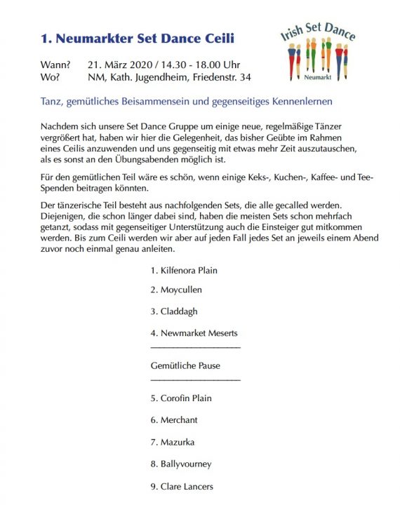 21.03.2020 @ 14:30 – 18:00 – *** Entfällt als Schutzmaßnahme gegen die Ausbreitung des Corona-Virus – wird baldmöglichst nachgeholt, Info folgt*** Nach den ersten zwei Übungsjahren jetzt das erste Ceili für die Neumarkter Set Dancers am 21. März 2020! Gäste und externe Tänzer sind natürlich sehr willkommen, sollten sich wegen des begrenzten Raumangebots aber zuvor anmelden: info@setdance.me +49 151 184 09 […]