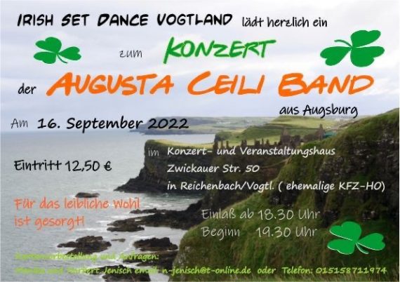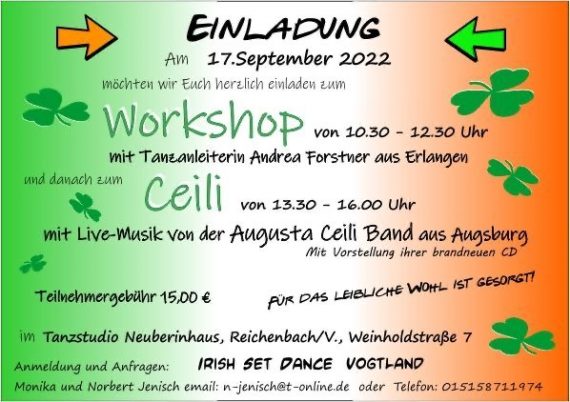 17.09.2022 @ 10:30 – 16:00 – Die Irish Set Dancers aus Reichenbach veranstalten auch dieses Jahr einen Irish Set Dance Workshop mit anschließendem Ceili. Der Workshop wird von Andrea Forstner aus Erlangen angeleitet, sie called auch während des Ceilis zur Live-Musik der Augusta Ceili Band aus Augsburg. Anmeldung und weitere Infos direkt bei den Veranstaltern (s.u.):
