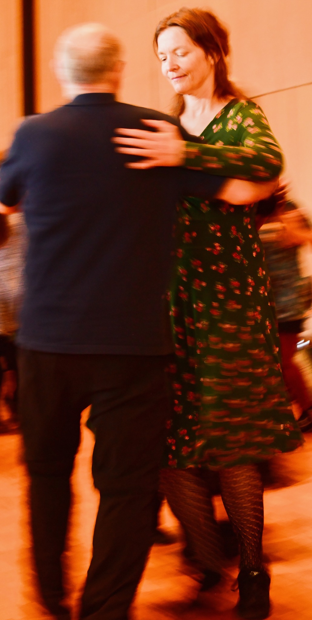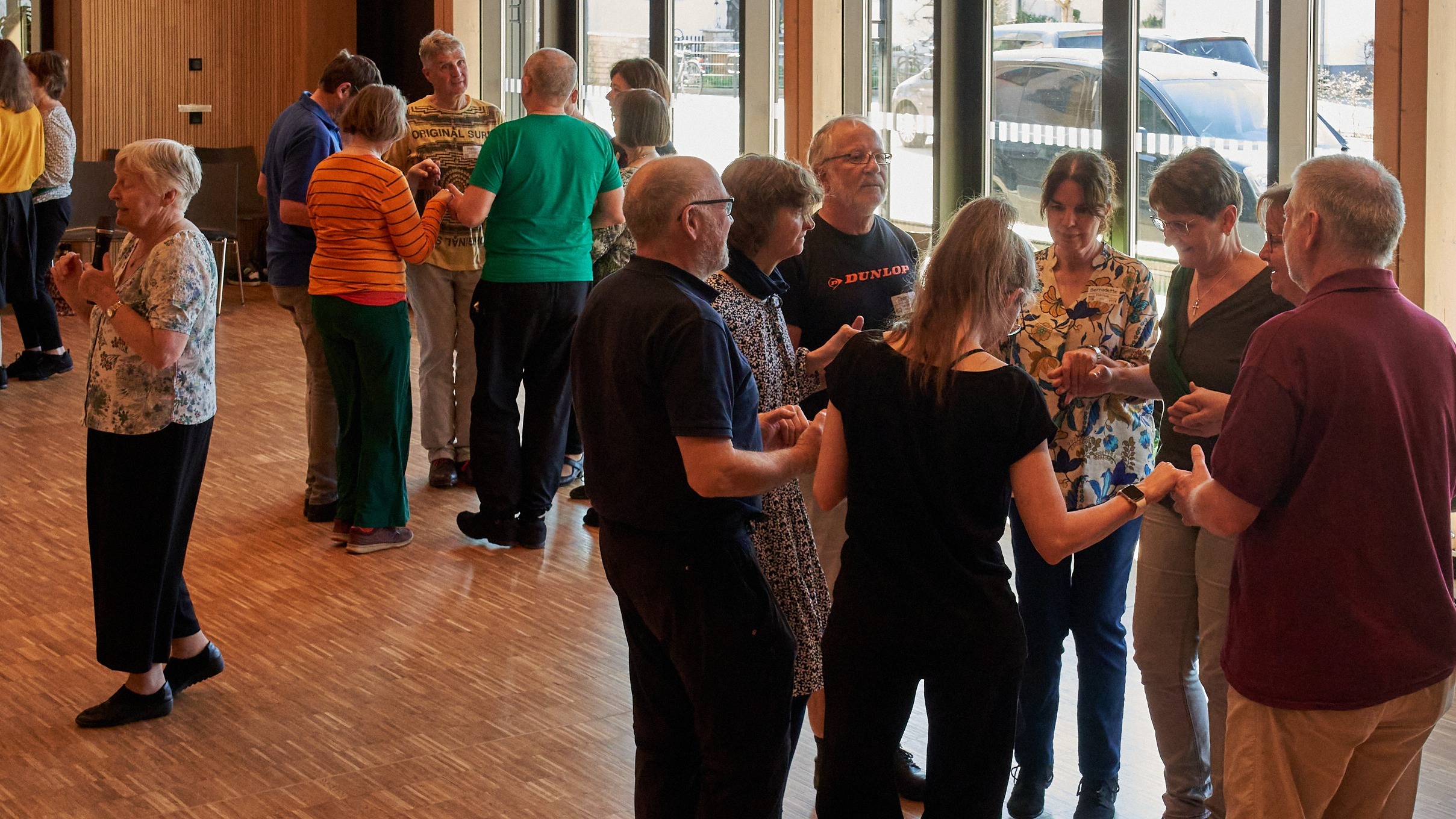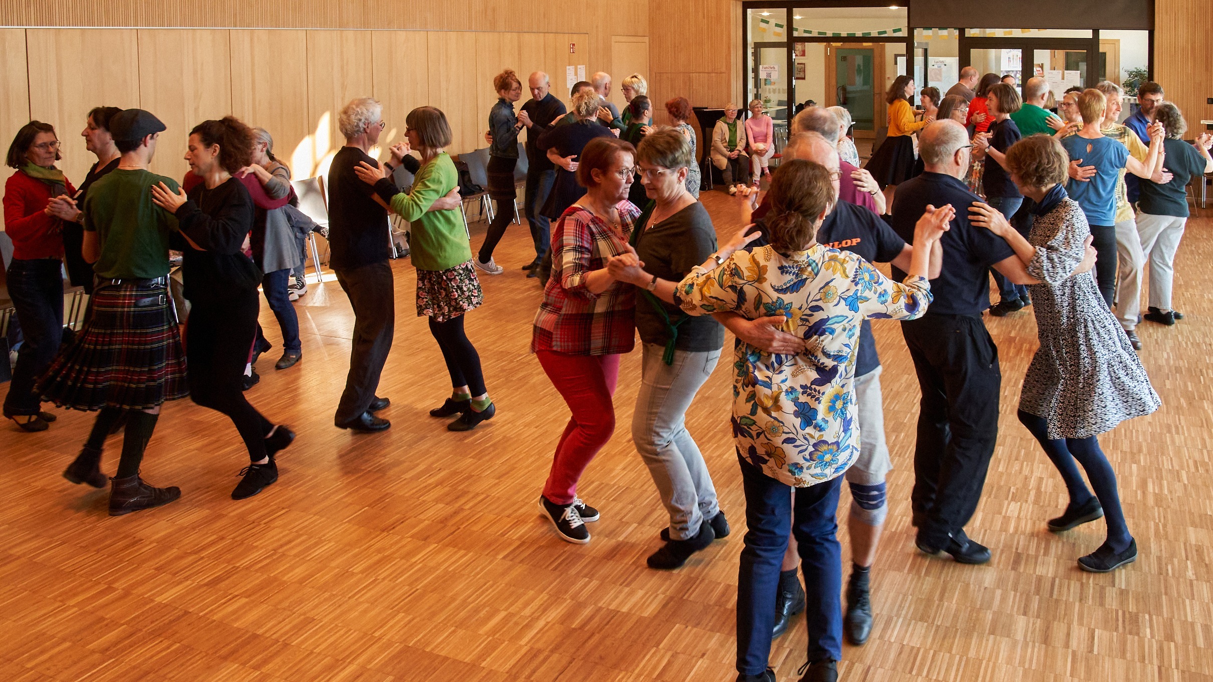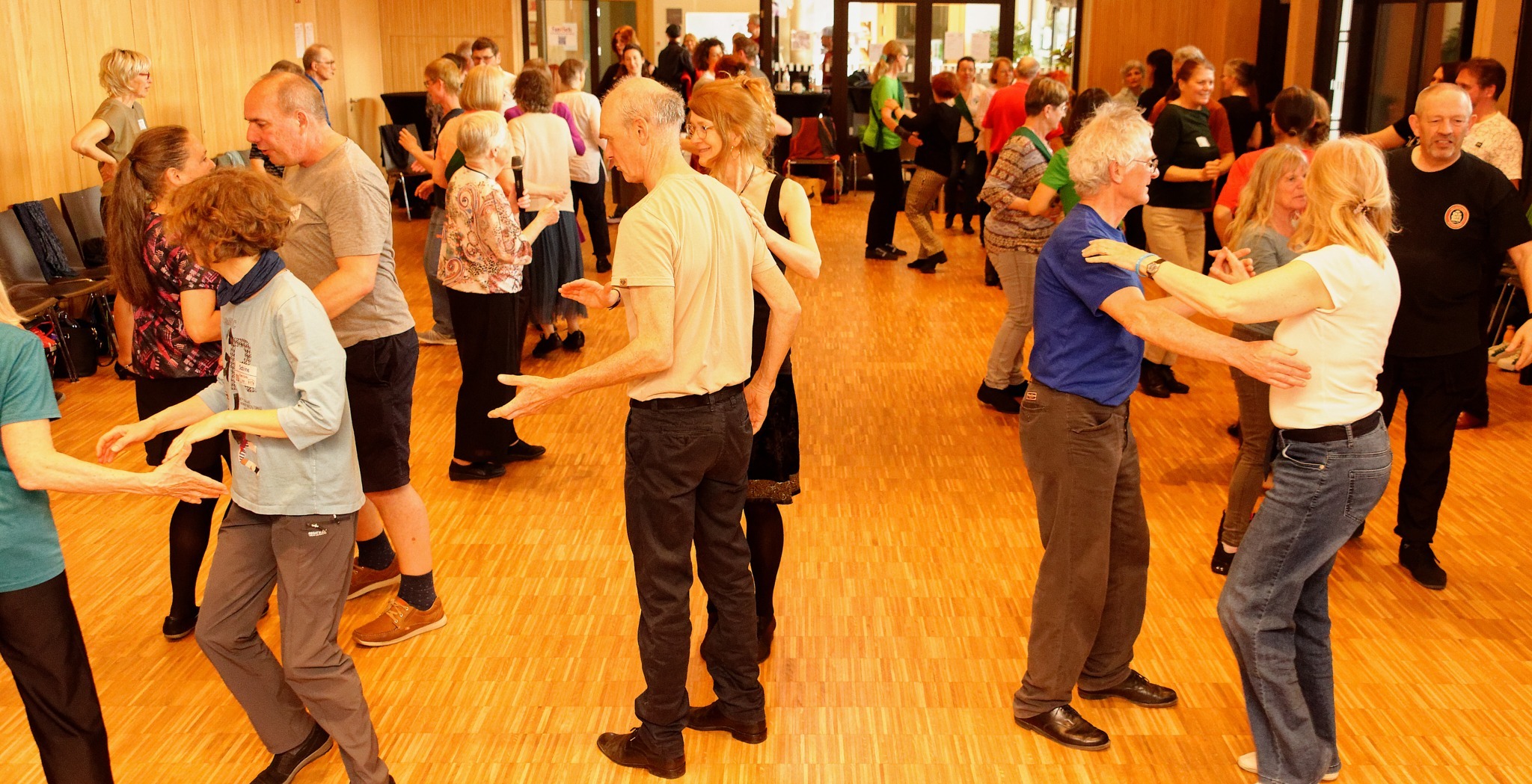 Danach tanzen wir die Figuren ohne weitergehende Hilfestellung. Damit hast Du viel Gelegenheit, die erklärungsbedürftige Figur aufzufrischen und einzuüben. Die Musik kommt von CD, sodass wir uns die Zeit dafür nehmen können.