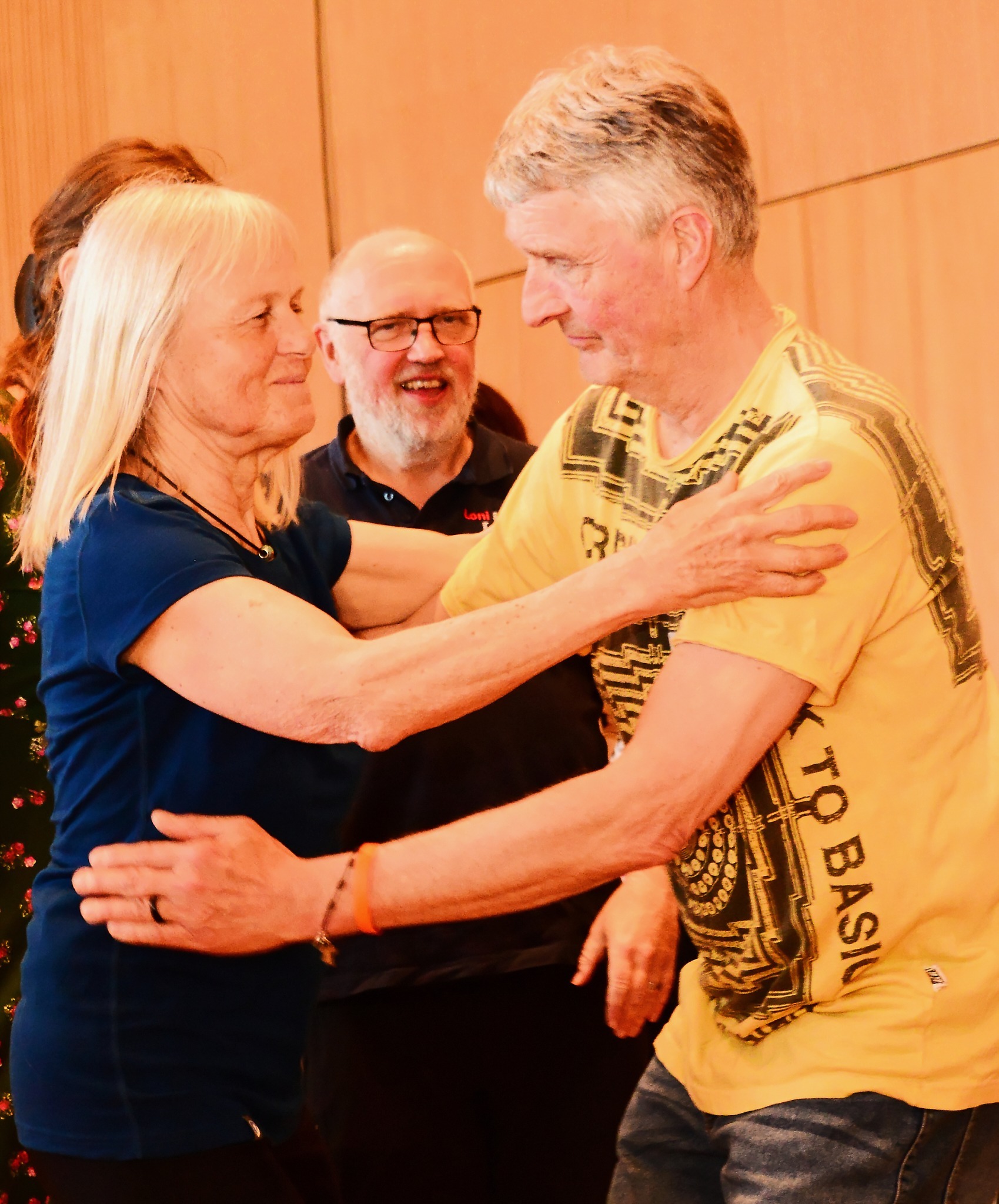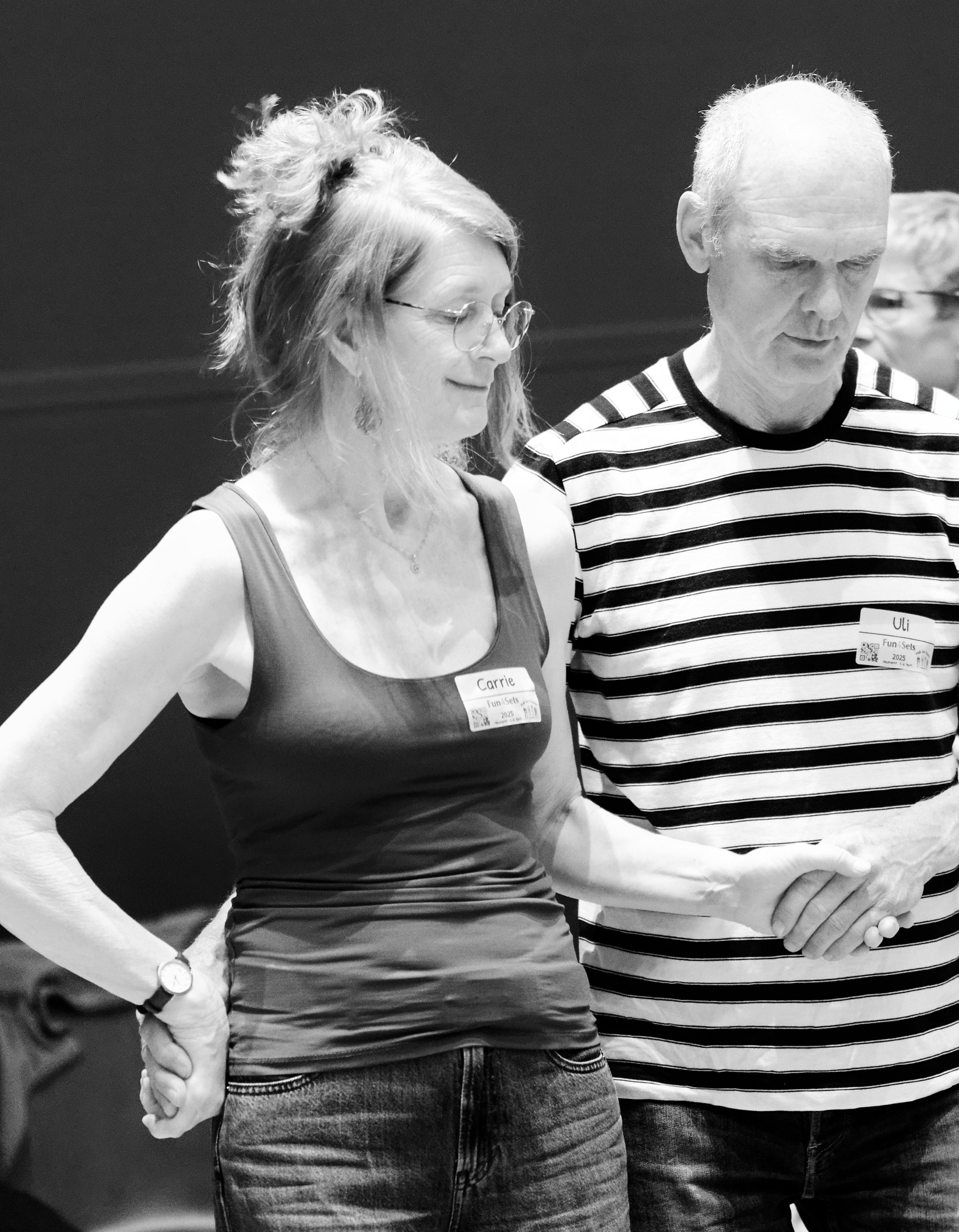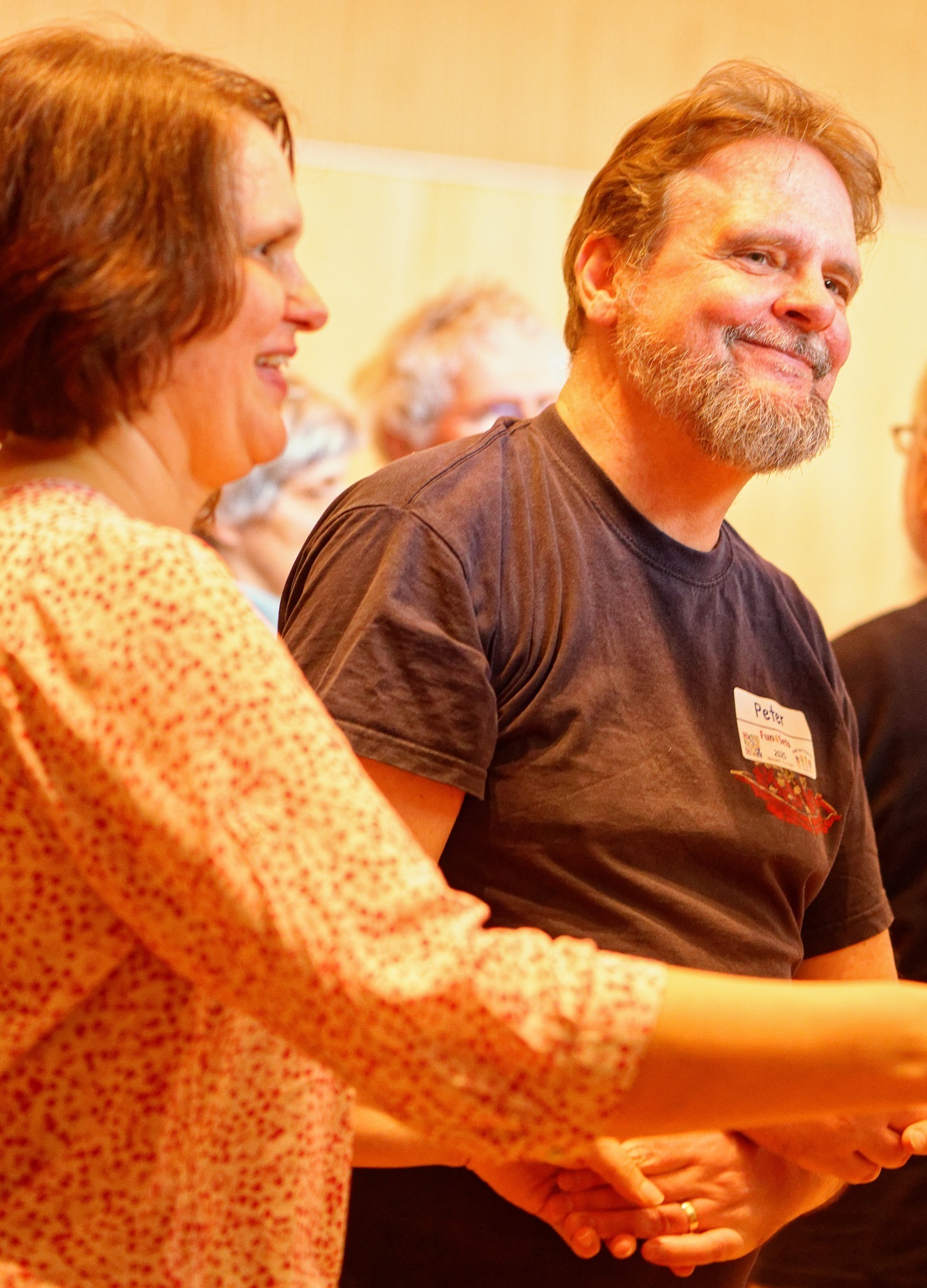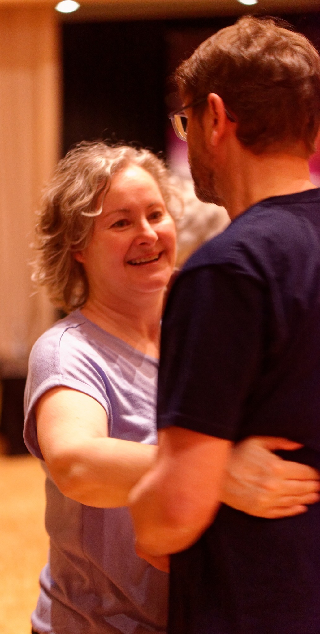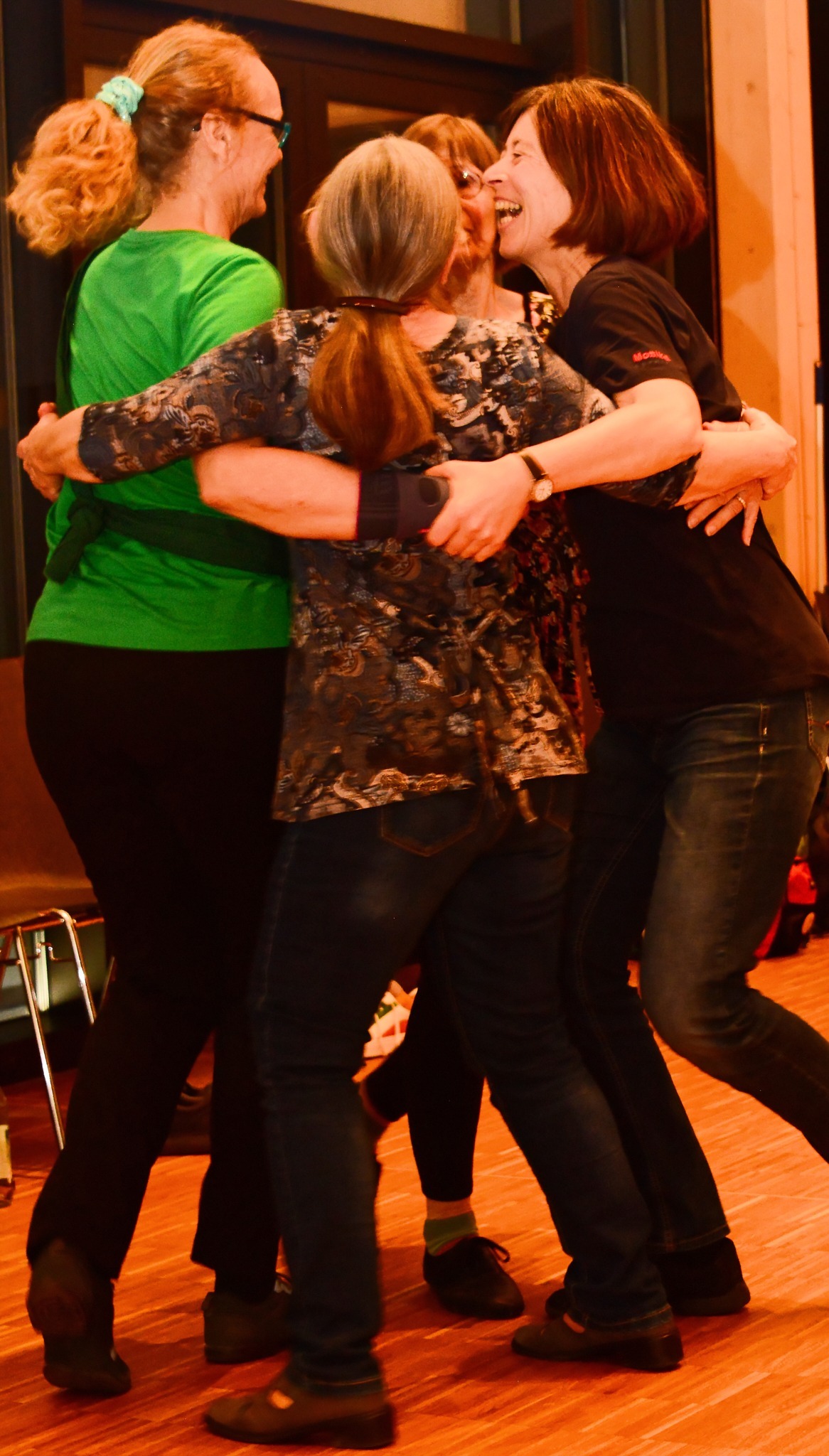 Danach tanzen wir die Figuren ohne weitergehende Hilfestellung. Damit hast Du viel Gelegenheit, die erklärungsbedürftige Figur aufzufrischen und einzuüben. Die Musik kommt von CD, sodass wir uns die Zeit dafür nehmen können.