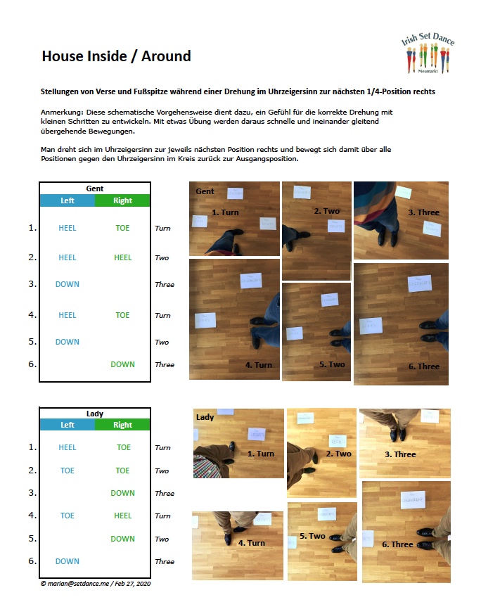 Mit die größte Schwierigkeit für Set Dance Neueinsteiger ist die Koordination beim „House Inside“/ „Show the Lady“ bzw. „House Around“.