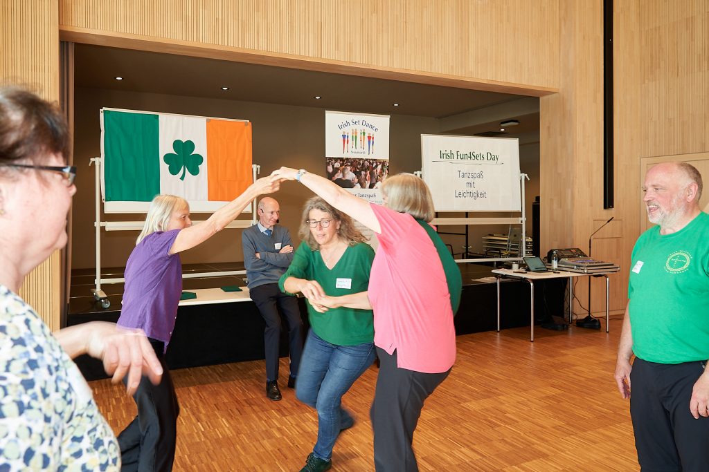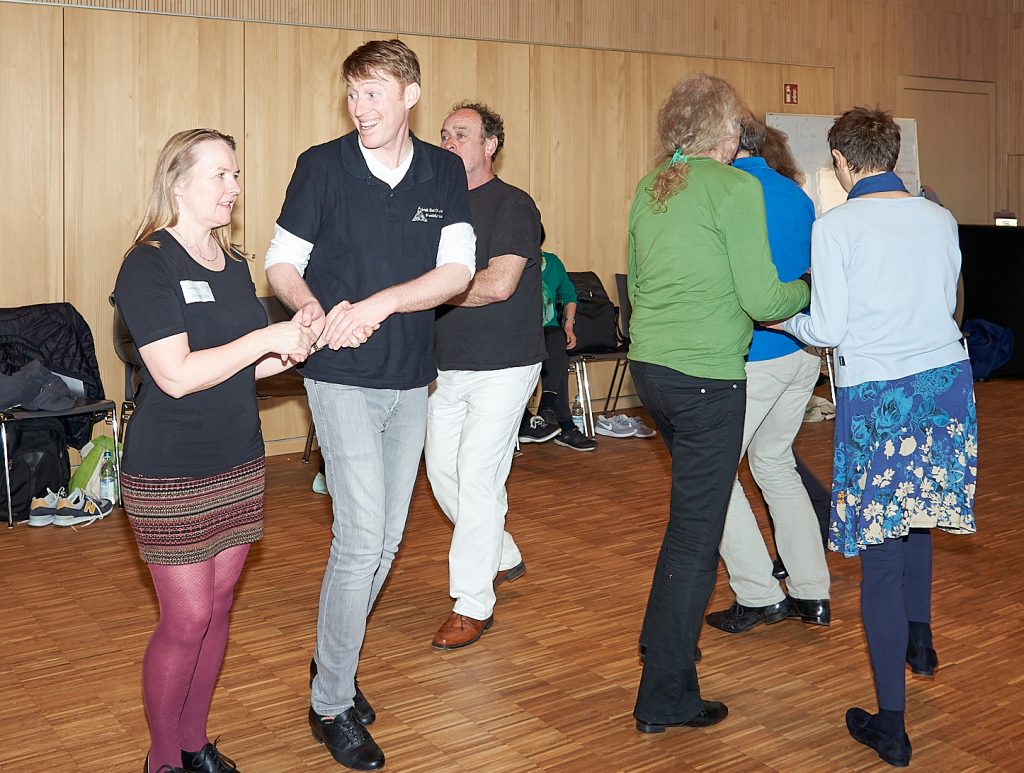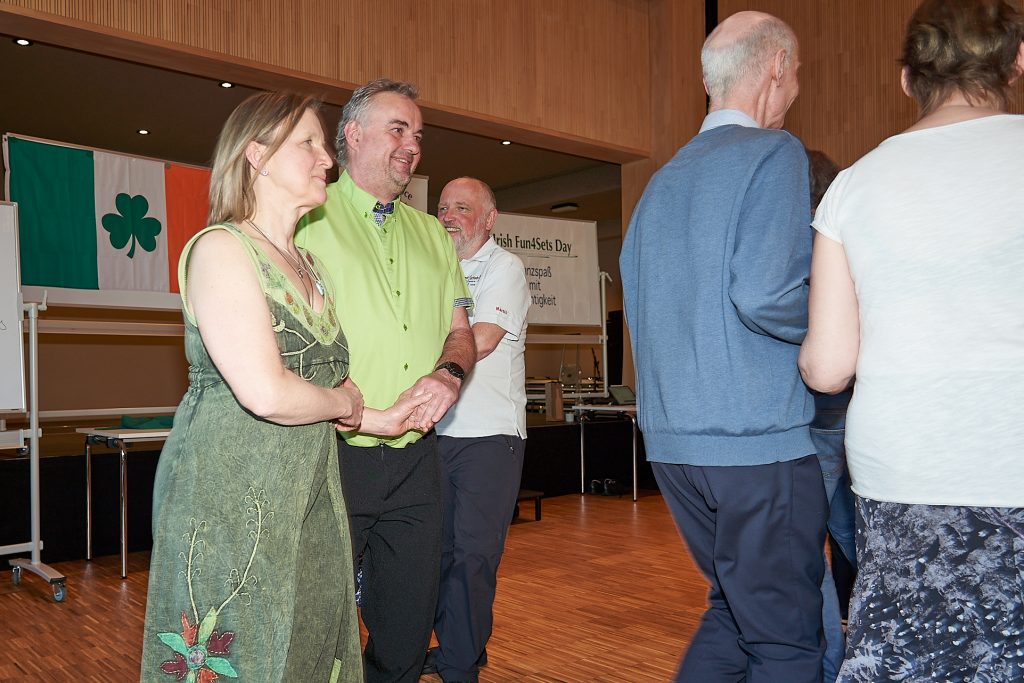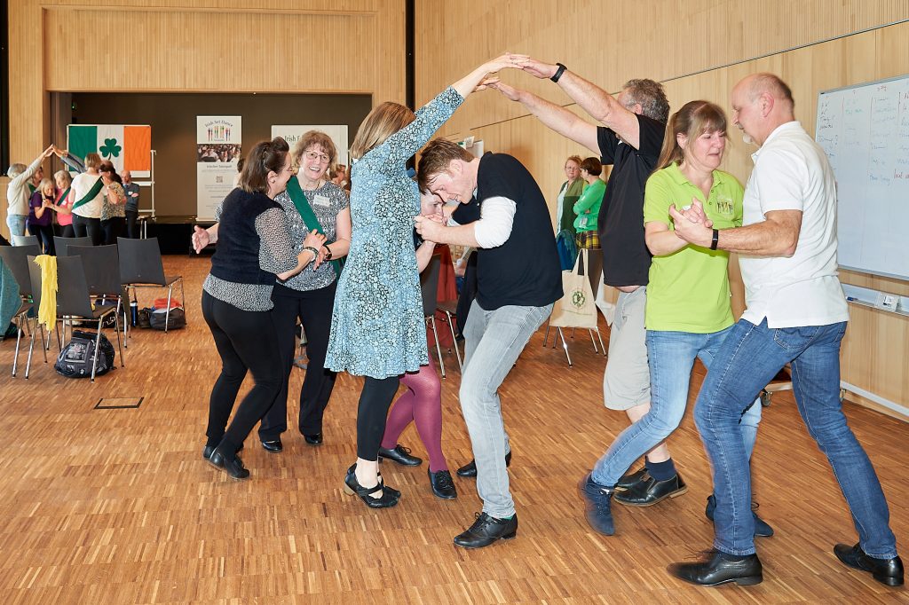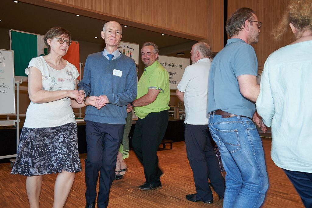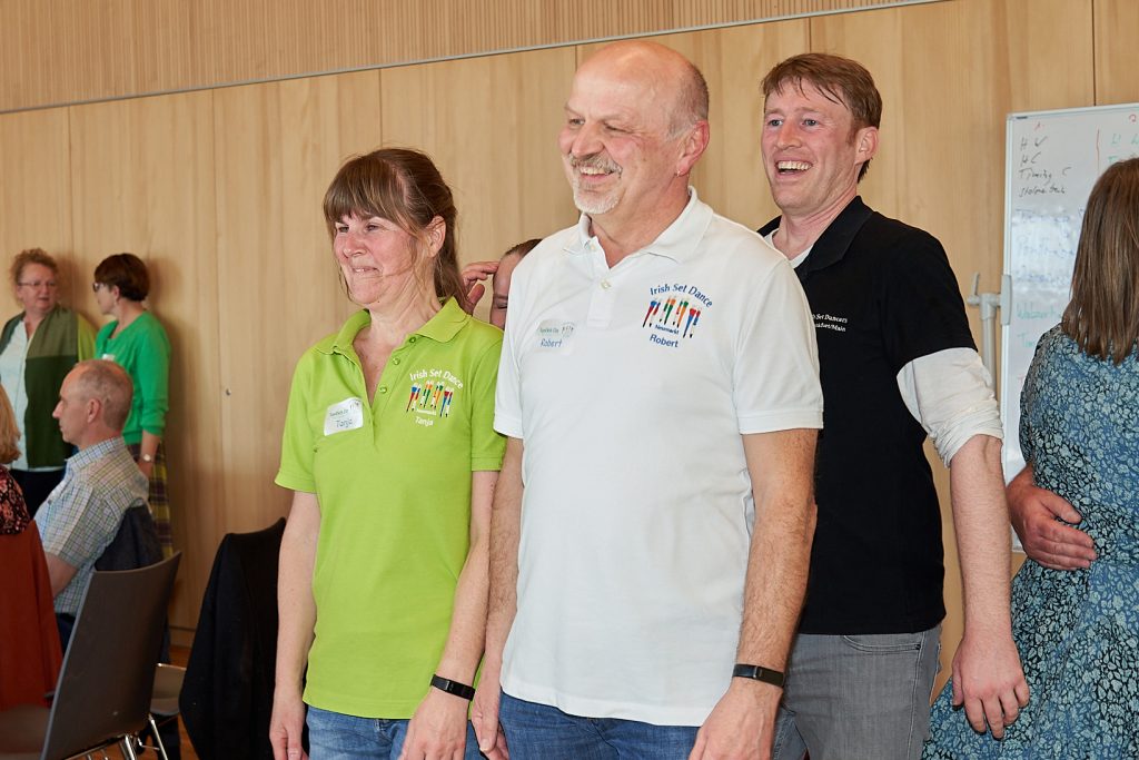 Im Vor- und Nachmittags-Workshop erklärte Muiris Tipps und Kniffe der tänzerischen Grundbewegungen anhand des Mazurka Sets, vorgeführt von einem Demonstration-Team. Durch häufige Übungen und vielfältige Feedbacks an die Tänzer-Sets festigten die Teilnehmer Tanzwissen, Tanzhaltungen und Tanzfertigkeiten, sodass alle Figuren des Sets abschließend non-stop komplett ohne Calling durchgetanzt werden konnten. Am Nachmittag folgte schließlich ein Ceili mit vielen weiteren Gelegenheiten, das Erlernte auch auf andere Sets zu übertragen und mit größerer Sicherheit anzuwenden. Die Ceili-Sets waren